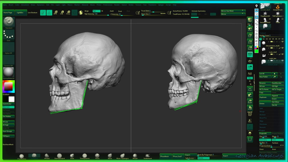 The tutorial comes with a .zpr file that includes the male and female skulls on which we’re going to explain the basic bone structure and with the ecorche I made a while ago which give you an easy way to identify each muscle and fat pad. There’s also a pureref file with more anatomy references and examples.