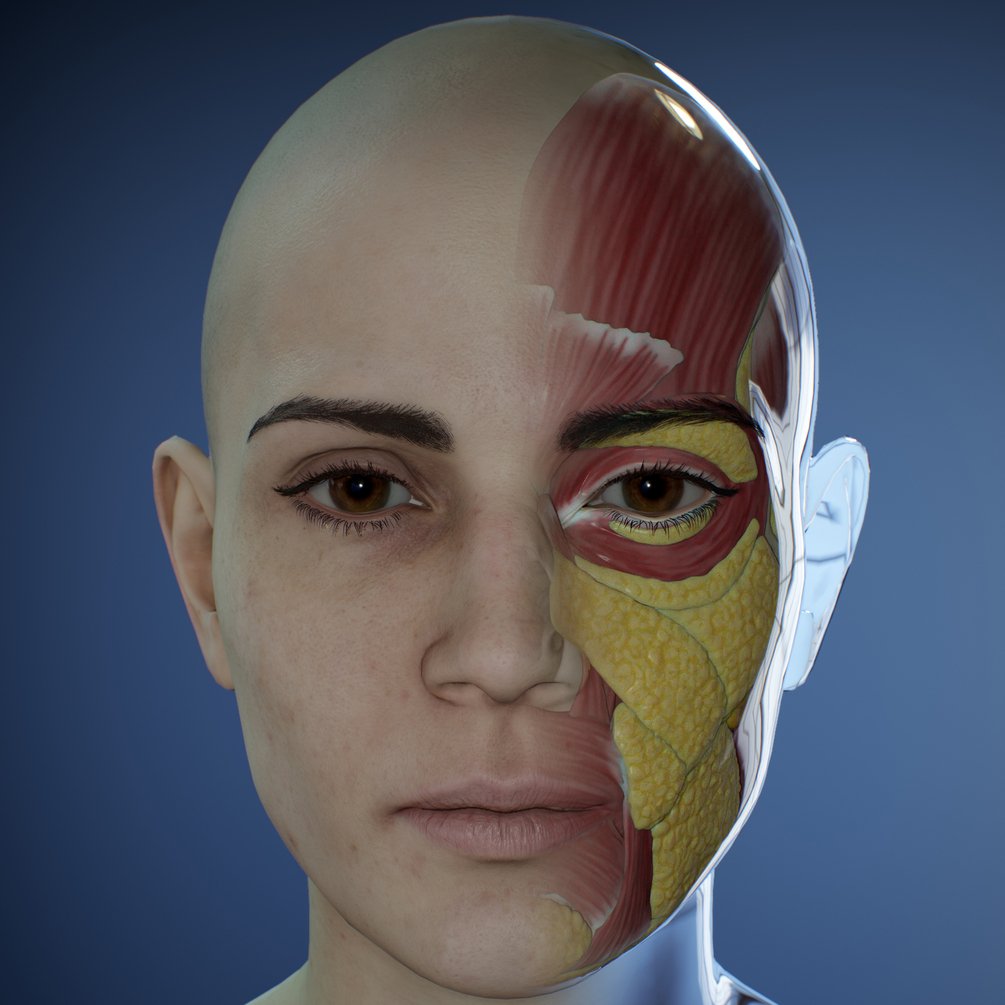 - Zbrush file that includes the head, eyes, eyebrows and eyelashes(geometry) and the full écorché with all the muscles and fat pads named correctly.